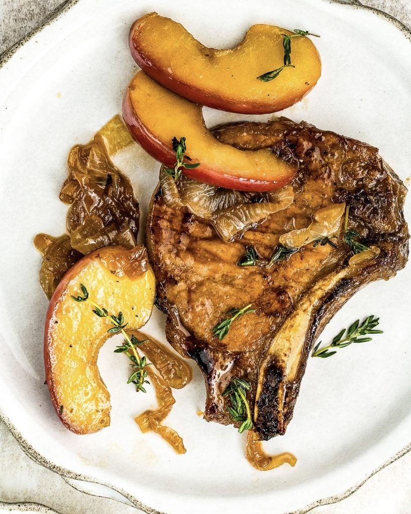This savory fall-inspired dinner brings out the rich flavor of apples by pairing them with seared pork chops and caramelized onions in a flavorful cider-based sauce.
